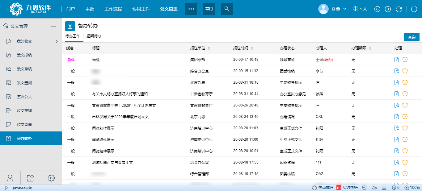3、支持不同類型的公文電子流轉,具備完成審批、填寫意見、修改文件、審核留痕、文件歸檔等功能,可以進行公文簽收跟蹤、催收、統計等操作。支持標準流程和非標流程兩種方式進行流轉。