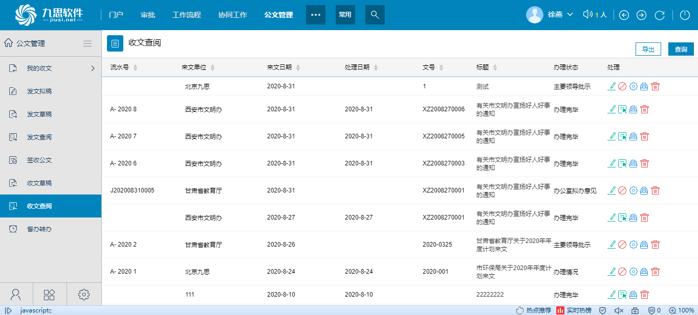 1)、在收文查閱管理頁面能按照標題、辦理狀態、文號、來文單位、流水號、來文日期、辦理時限查詢
