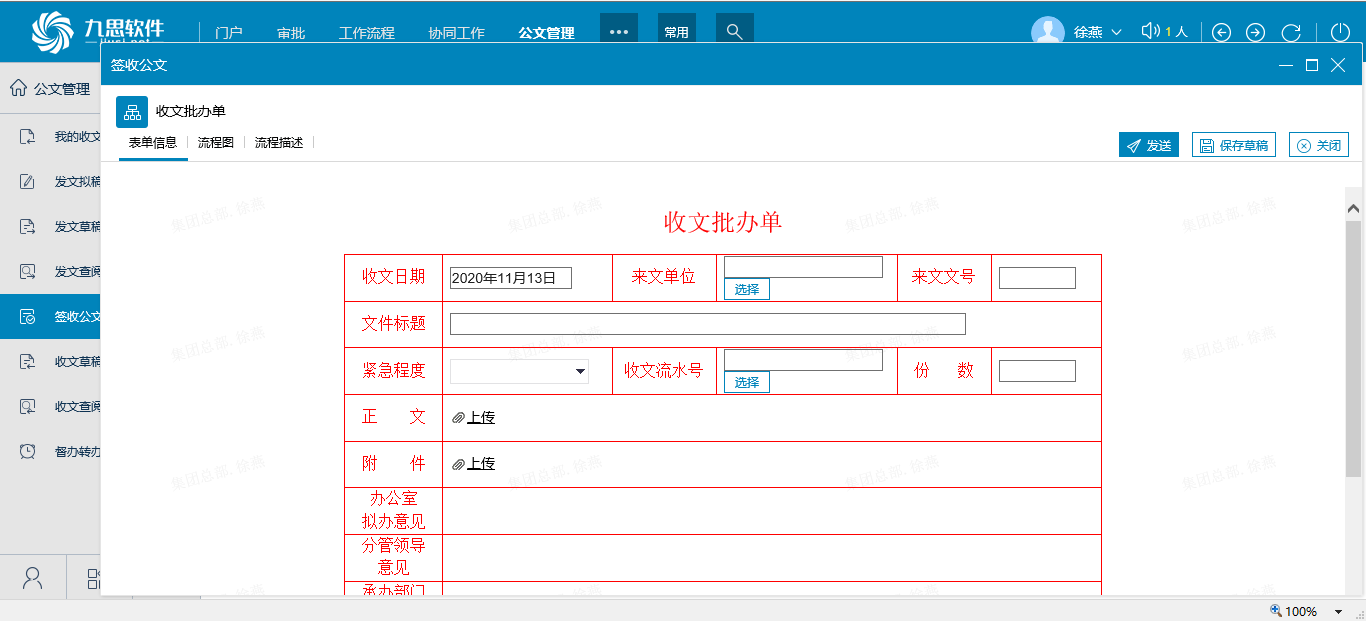 公文管理OA解決方案實現了收文管理和發文管理的自動化,功能包括:我的收文、發文擬稿、發文草稿、發文查閱、發文設置、簽收公文、收文查閱、收文設置等,并且公文的正文支持修改留痕、手寫簽名、套紅頭、簽章等各種應用。可靈活設定公文流程,自動進行流程跟蹤、催辦、查辦,并可歸類存檔和檢索等。