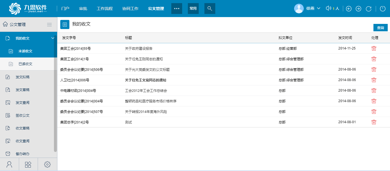 2)、發文查閱管理頁面用戶可以刪除、修改。