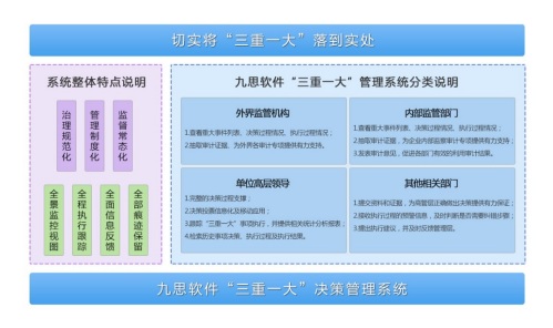 九思軟件“三重一大”決策管理系統通過全程有效監控的電子監察平臺的全景監控、全程跟蹤,信息反饋,針對系統四類主要用戶的不同需求,建立健全“三重一大”科學決策、高效執行、有效監督的工作體制和機制,防范決策風險;