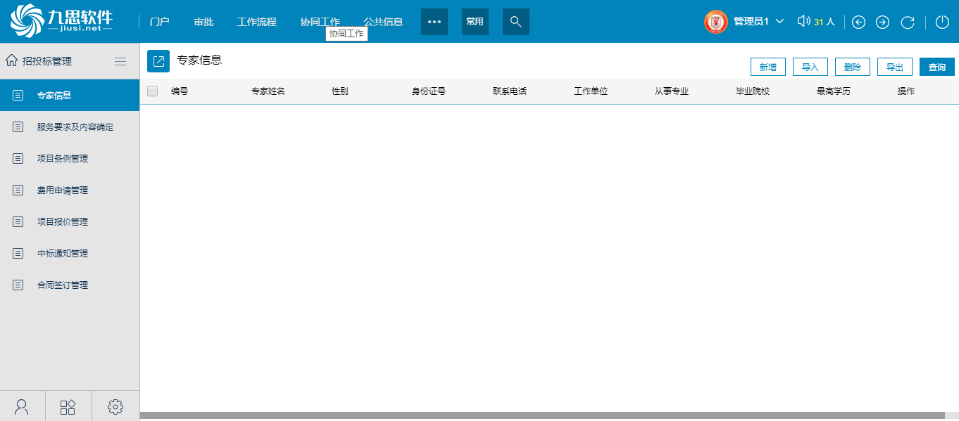 九思招投標協同OA系統可實現客戶資源集中管理針對招標過程中所需專家信息進行集中管理及對招標項目費用收益等情況的數據管理分析匯總,幫助招投標機構實現招投標企業對核心業務工作的標準化、信息化