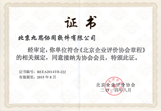 憑借過硬的技術(shù)實(shí)力、良好的市場(chǎng)口碑,以及誠(chéng)信的經(jīng)營(yíng)模式,九思軟件通過了北京企業(yè)評(píng)價(jià)協(xié)會(huì)的嚴(yán)格審核,確定符合《北京企業(yè)評(píng)價(jià)協(xié)會(huì)章程》的所有規(guī)定,被納入北京企業(yè)評(píng)價(jià)協(xié)會(huì)會(huì)員行列,并頒發(fā)證書和牌匾。