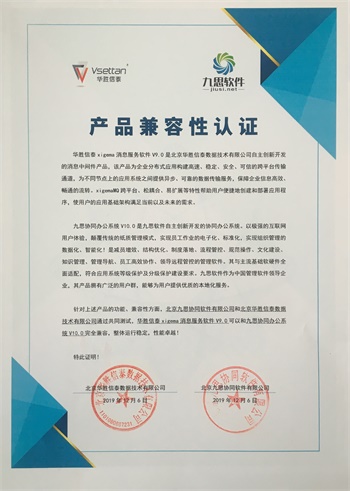 近日,北京九思協同軟件有限公司與北京華勝信泰數據技術有限公司,就九思協同辦公系統V10.0與華勝信泰xingema數據庫管理系統V12.10、華勝信泰xingema消息服務軟件V9.0、華勝信泰xingema應用服務軟件V9.1完成產品兼容性相互認證測試。