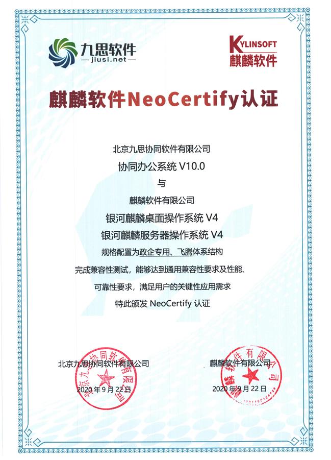 近日,北京九思協(xié)同軟件有限公司(簡(jiǎn)稱“九思軟件”)產(chǎn)品協(xié)同辦公系統(tǒng)V10.0與麒麟軟件有限公司(簡(jiǎn)稱“麒麟軟件”)產(chǎn)品銀河麒麟桌面(飛騰版)V4、服務(wù)器(飛騰版)V4完成產(chǎn)品兼容測(cè)試,喜獲兩項(xiàng)麒麟軟件NeoCertify認(rèn)證。