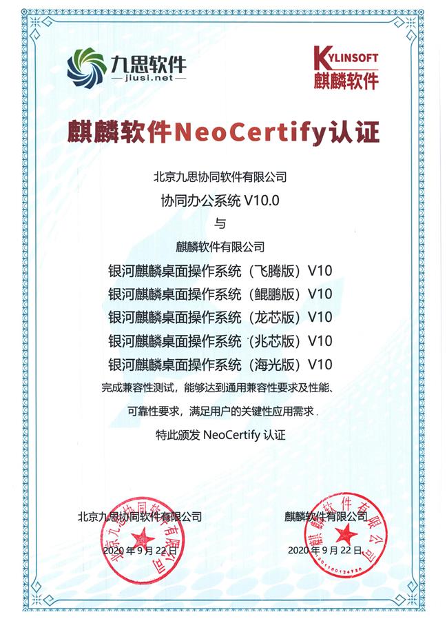 近日,專注協同辦公自動化的OA廠商北京九思協同軟件有限公司(簡稱“九思軟件”)與中國操作系統新旗艦—麒麟軟件有限公司(簡稱“麒麟軟件”)共同完成產品兼容互認證!測試結果確定九思協同辦公系統V10.0與銀河麒麟桌面操作系統(飛騰版、鯤鵬版、龍芯版、兆芯版、海光版)能夠達到通用兼容性要求及性能、可靠性要求,可充分滿足用戶的關鍵性應用需求。