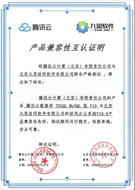 近日,九思協同辦公系統V10.0與騰訊云數據庫TDSQL MySQL 版順利完成產品兼容性互認證。雙方聯合測試結果表明:九思OA協同辦公系統平臺與騰訊云數據庫TDSQL兼容良好,性能卓越,系統運行穩定,可順利部署并對外提供服務。