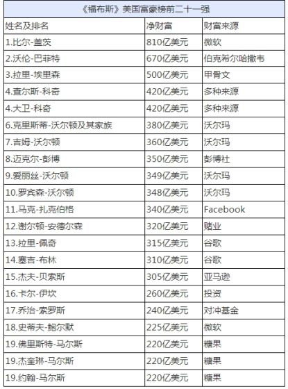 與此同時,Facebook聯合創始人暨現任CEO馬克·扎克伯格(Mark Zuckerberg)則成為美國富豪排行榜上躥升最快的人,他以347億美元的凈財富排在第11位,其身家與去年相比增加了150億美元,主要由于Facebook在2012年IPO(首次公開招股)上市時的股價表現令人失望,但隨后已有所回彈。