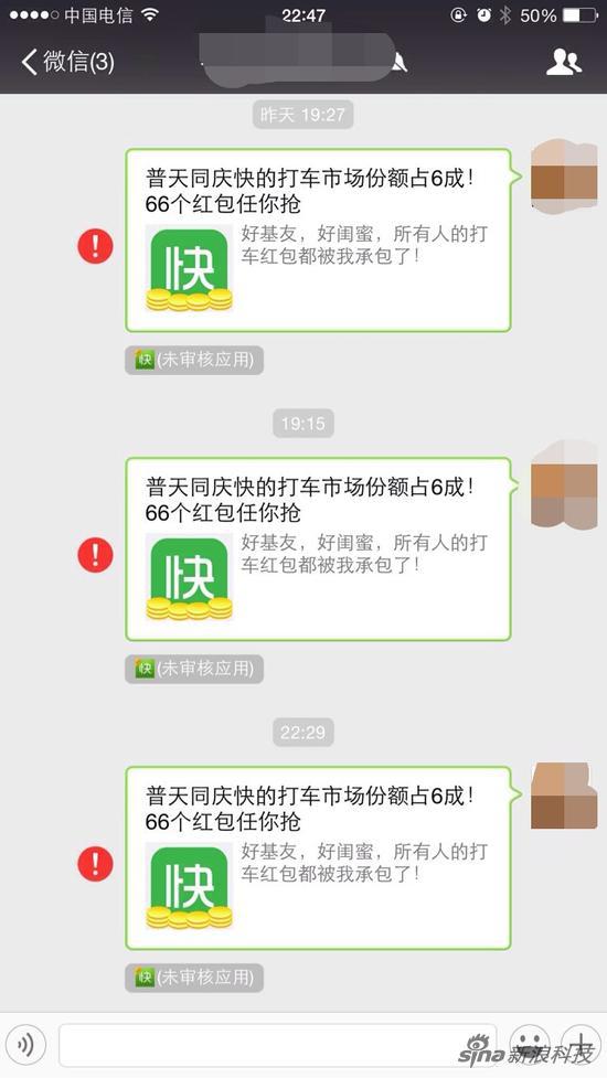 據悉,11月21日起有用戶反映此前可以在微信分享給好友的快的打車紅包被微信官方屏蔽,從而導致用戶無法正常參與活動。