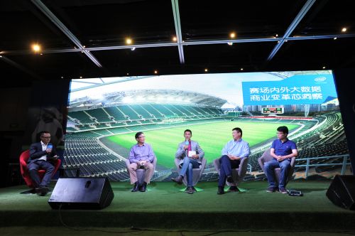 論壇參與嘉賓(左起)著名節(jié)目主持人魏翊東、英特爾中國數(shù)據(jù)中心及云計算業(yè)務(wù)產(chǎn)品市場總監(jiān)賀曉東、著名足球運動員商毅、奧美體育營銷總監(jiān)強煒、虎撲體育主編陳中捷