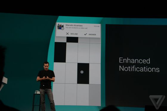 通知在鎖屏界面排列顯示,類似iOS,每條通知都以條狀方式羅列顯示,不再隱藏于下拉菜單中,用戶可滑動(dòng)或雙擊直接快速進(jìn)入相關(guān)應(yīng)用。另外,谷 歌還介紹了全新的浮動(dòng)通知模式,比如用戶在玩游戲時(shí)有來(lái)電,并不會(huì)跳出游戲界面,而是彈出浮動(dòng)卡片通知,你可以選擇接聽(tīng)也可以掛斷繼續(xù)游戲。