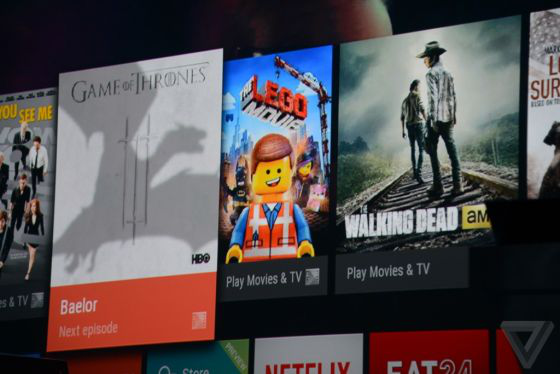 谷歌推出Android TV應(yīng)用程序,運(yùn)行在全新Android L操作系統(tǒng),可通過(guò)HDMI連接電視輸出內(nèi)容。主界面支持在頂部位置顯示正在播放的演出活動(dòng)以及電影,多媒體資源以卡片式展示,界面非常簡(jiǎn)潔直觀,色彩跳躍明亮。