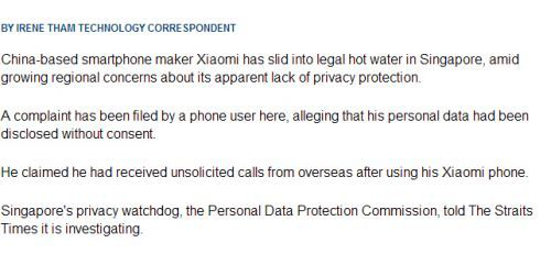 一名新加坡的小米用戶向當地監管部門投訴,稱他在使用小米手機后,收到很多來自外國的不明電話,疑似是個人信息被泄露。