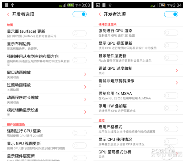 這些設置在安卓4.0以后版本中,一般隱藏在開發者選項中,主要增強手機使用中的觀感效果和流暢度。對于動畫效果,主要用于頁面切換,建議直接關閉,沒 有實質作用還可能影響手機流暢度。而GPU的硬件加速功能,對于整機的流暢度的提升,尤其在觀看高清視頻或者高畫質游戲時都有很好的提升效果。建議那些對 高流暢度和高畫質有要求的朋友開啟,一般情況下,不建議開啟。