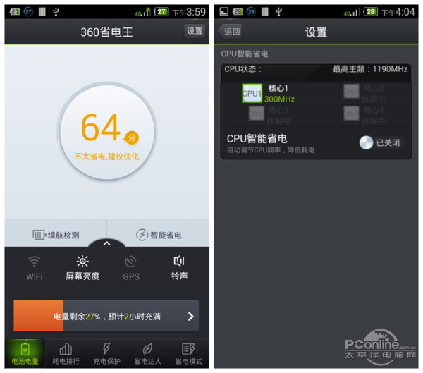 唯一讓小編感興趣的就是有些省電軟件中可以控制CPU的頻率,通過降頻來降低硬件功耗。雖然安卓系統能夠自動的測算調整頻率,但是就如同汽車一樣,手動 檔的總體上會比自動檔的省油些。在日常使用時,調到一個較低頻率,如果需要開啟多個程序或者玩游戲,再調至高頻率。實測的確有一定的用處,不過省電效果也 很有限,并且必須獲取ROOT權限。
