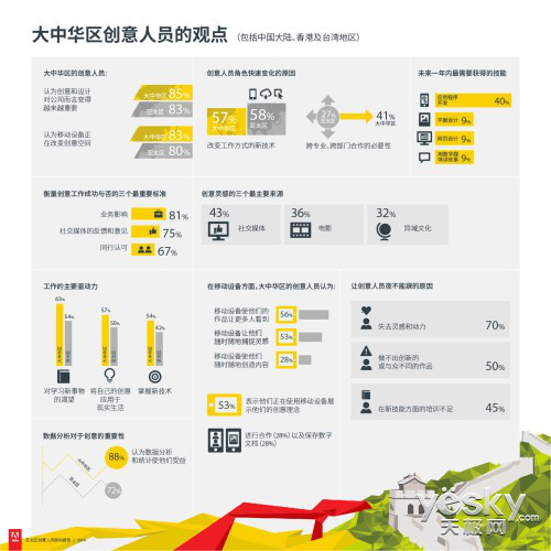 該研究報告顯示,大中華區(qū)有43%的受訪者表示,社交媒體已經成為他們創(chuàng)意靈感的最重要來源。除此之外,來自電影(36%)、異域文化(32%)以及廣告和在線創(chuàng)意社區(qū)的靈感也為他們的工作帶來了巨大的影響。