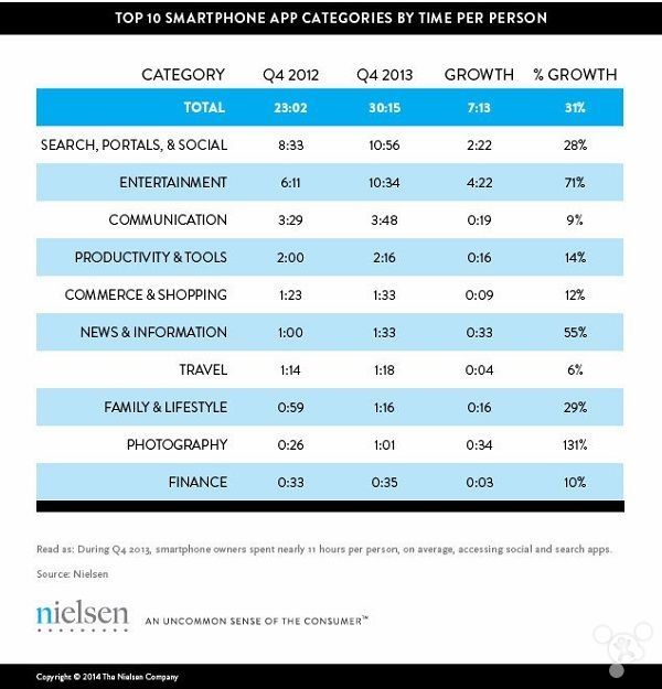 到去年年底,用戶在移動應用上花費的時間從2011年的18小時18分增加至30小時15分。而平均每月使用的應用的數量則僅從23.3增加至26.8。也就是說,雖然我們花掉的時間更多,但是我們用來用去還就是那么多款應用而已。