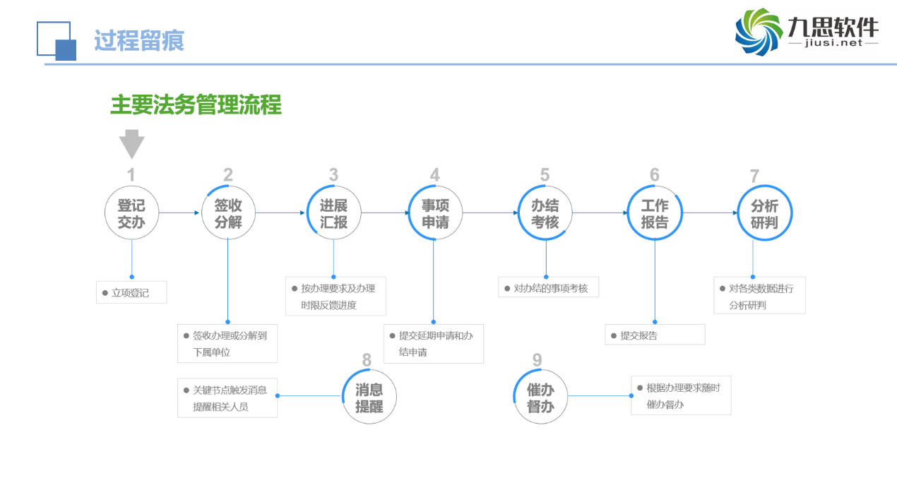 九思法務管理系統,通過全方位的流程動態監控以及界面化管理形式,實現法務管理工作從登記交辦、簽收分解、進展匯報、到事項申請、辦結考核、工作匯報,對各類數據進行分析研判,關鍵節點觸發消息提醒相關人員,根據辦理要求臨時催辦督辦等,法務管理全流程記錄,過程留痕可回溯管理。