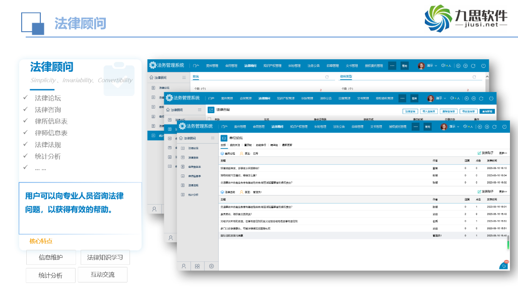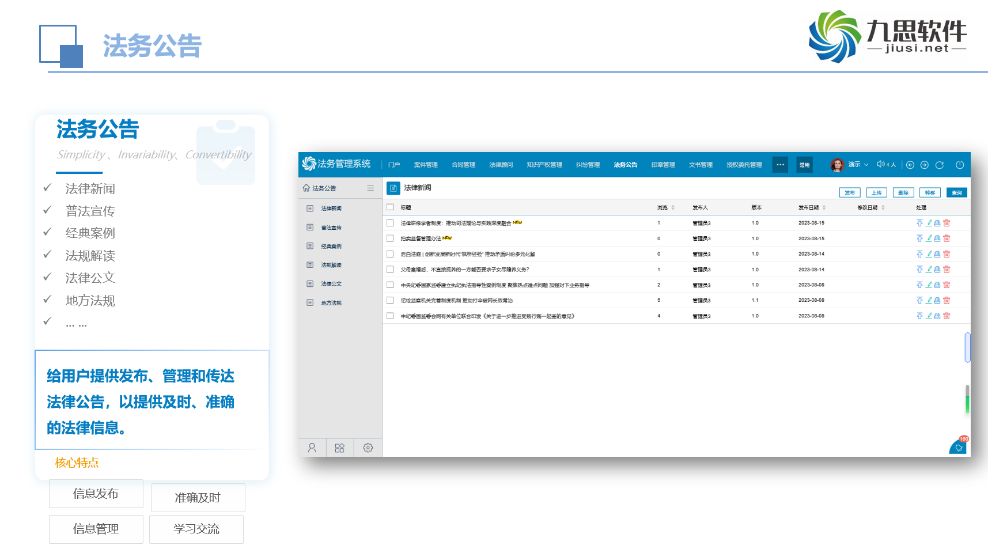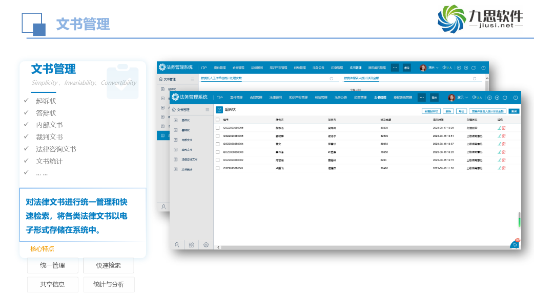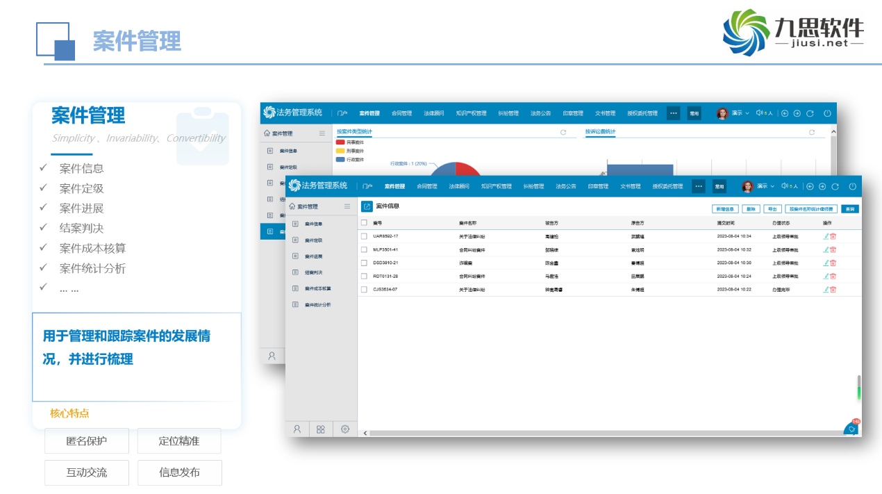 九思法務管理系統,通過流程實現案件的全生命周期管理,提供案件管理、糾紛管理、法律顧問、文書管理、授權. . .