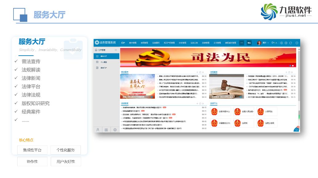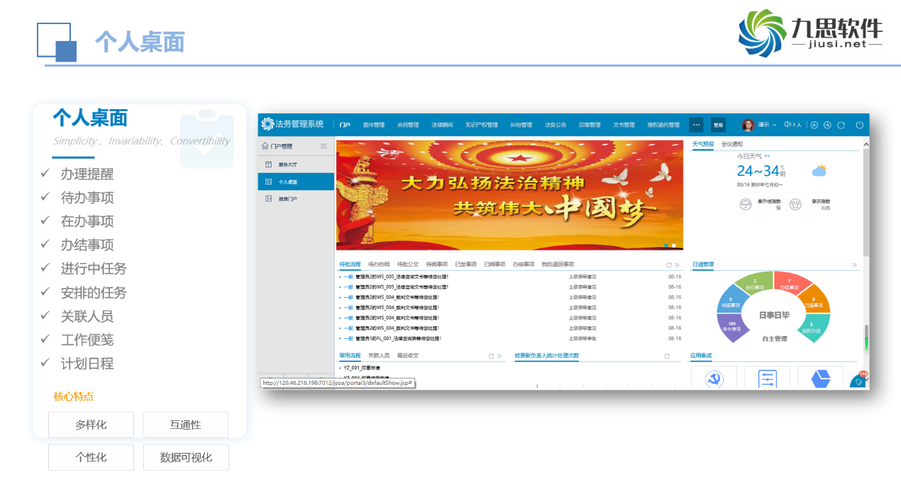 九思法務管理系統,通過流程實現案件的全生命周期管理,提供案件管理、糾紛管理、法律顧問、文書管理、授權委托管理等業務功能,定制專屬法務門戶,構建法務共享服務中心,通過對糾紛案件的實時、動態追蹤,對法律風險事件實現閉環管理,有效提升法務工作效率。