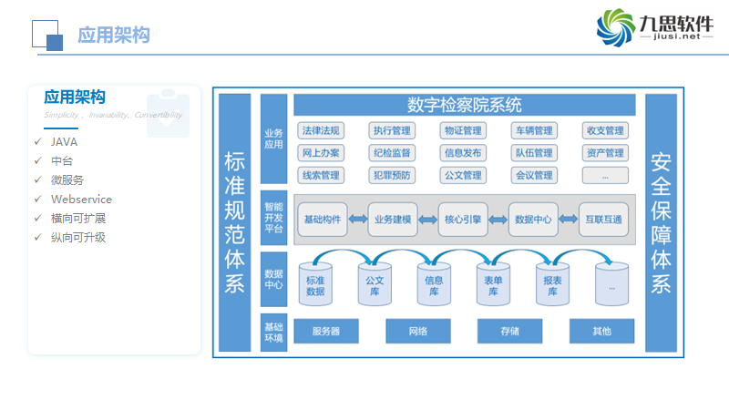 九思數字檢察院系統,由基礎設施層、數據中心層、智能開發平臺底座、業務應用層和門戶管理組成,同時支持多種登錄安全策略。