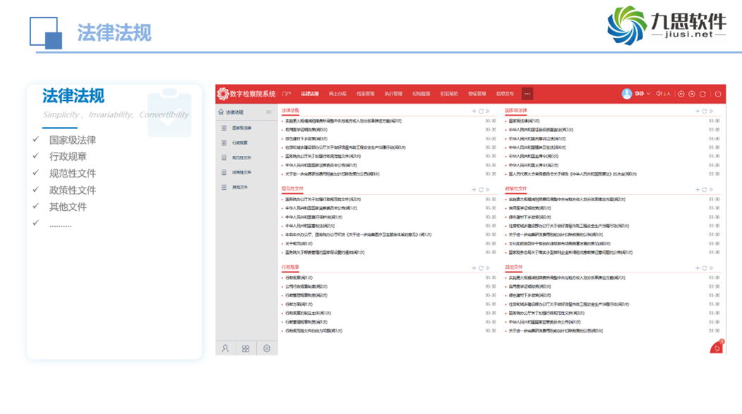 實現國家及地方性的法律法規的管理,方便查閱,以避免出現法律方面的漏洞,從而實現檢察工作的專業化精準化。