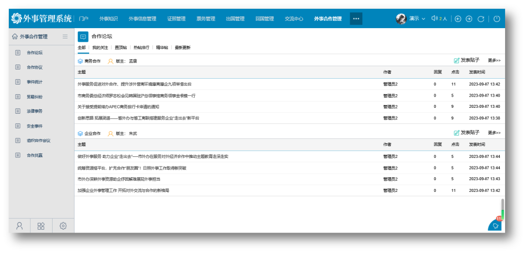 本模塊專注于外事業務合作,覆蓋合作論壇、合作協議、組織合作會議和合作共贏等功能。用戶可以在合作論壇上討論主題,交流觀點,促進互相學習。合作協議和組織合作會議模塊則負責存儲和管理與合作伙伴之間的合作協議,包括協議內容、簽署日期和有效期等,有助于合作協議的管理和合規性。此外,該模塊還提供專業知識和技能,協助解決涉外糾紛,通過數據分析幫助管理者更好地應對涉外糾紛。