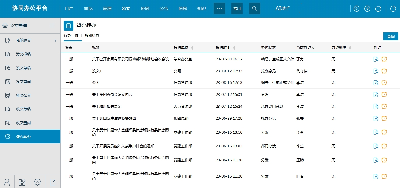 借助于成熟的流程化收發文機制,各層級領導能夠直接對接各自分管科室進行公文審閱與辦理。同時,利用OA系統,相關人員可以實時查看和追蹤收發文狀態及處理進程,確保公文處理的及時性和團隊協作性得到全面提升。