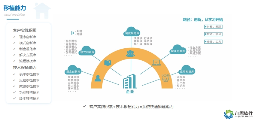 平臺強大的管理移植能力,主要源于九思十六年的客戶實踐積累,以及在移植技術方面的開拓創新。通過技術技術,可以通過一鍵導入的方式,快速地把A客戶的成功實踐,移植成B客戶的管理創新。