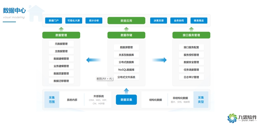 平臺內置的數據中心,可以采集來自內外部的、結構化和非結構化的數據,并且通過數據管理、存儲和接口服務,實現對關鍵數據的增值應用。