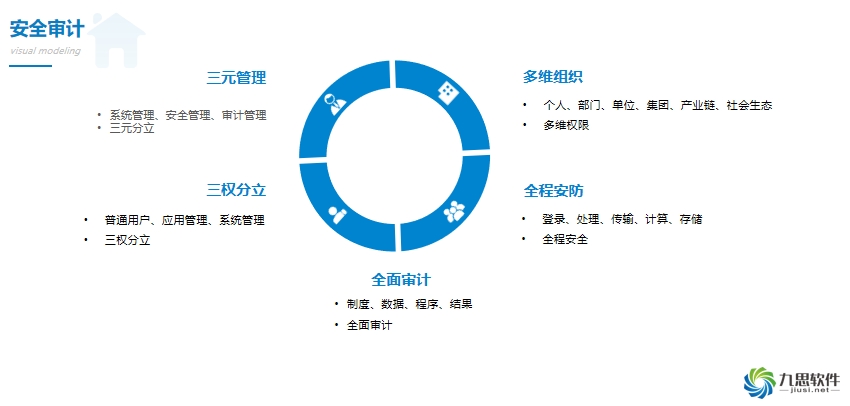 在產品的安全審計方面,九思不僅是提供了三員管理,而且提供了三權分立、全面審計,并且支持多維組織形態、全程安防控制。