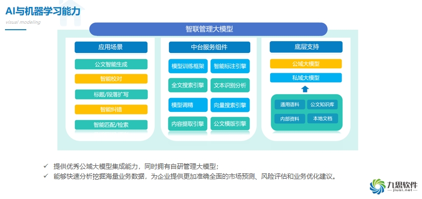 提供國內外市場上優秀的公域大模型的集成能力,同時自研智聯管理大模型,能夠快速分析、挖掘和理解海量業務數據,為企業提供更加準確、全面的市場預測、風險評估和業務優化建議。