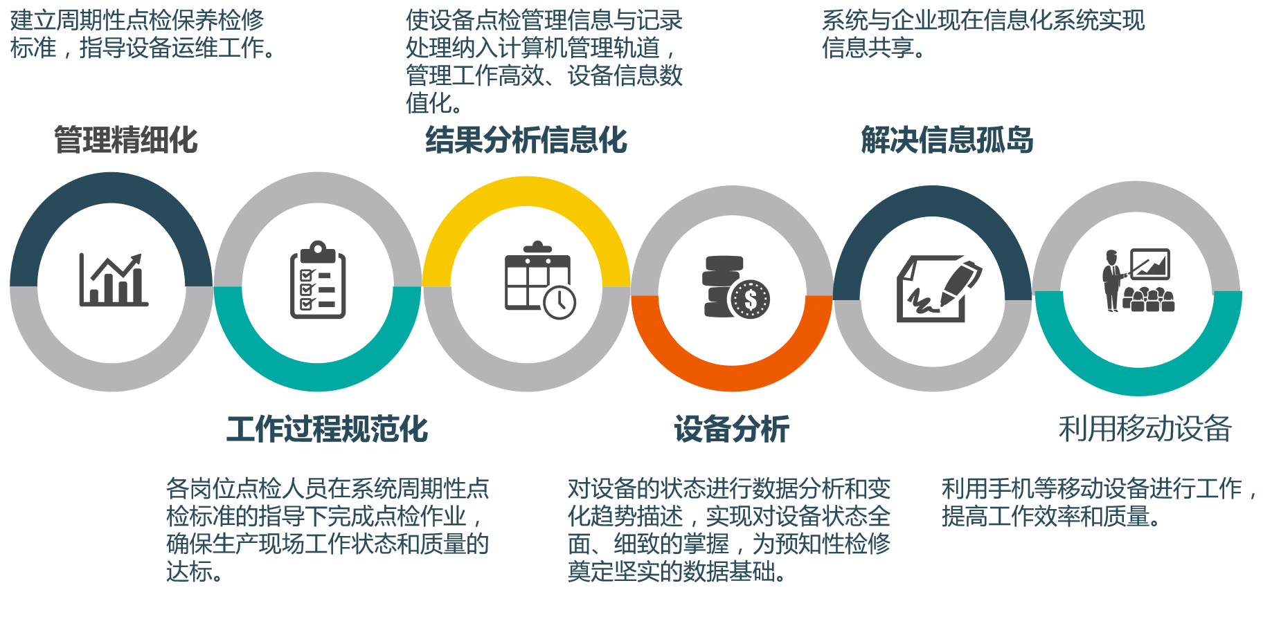 利用系統建立完整的設備運維管理體系,包括設備信息管理及設備業務管理,設備的動態信息來源于設備業務過程,設備業務管理則起到調控業務過程的作用。解決了周期性點檢保養檢修標準的工作過程規范化, 做到檢查項目按檢修標準執行、并留有電子痕跡,提高工作效率及管理效率。