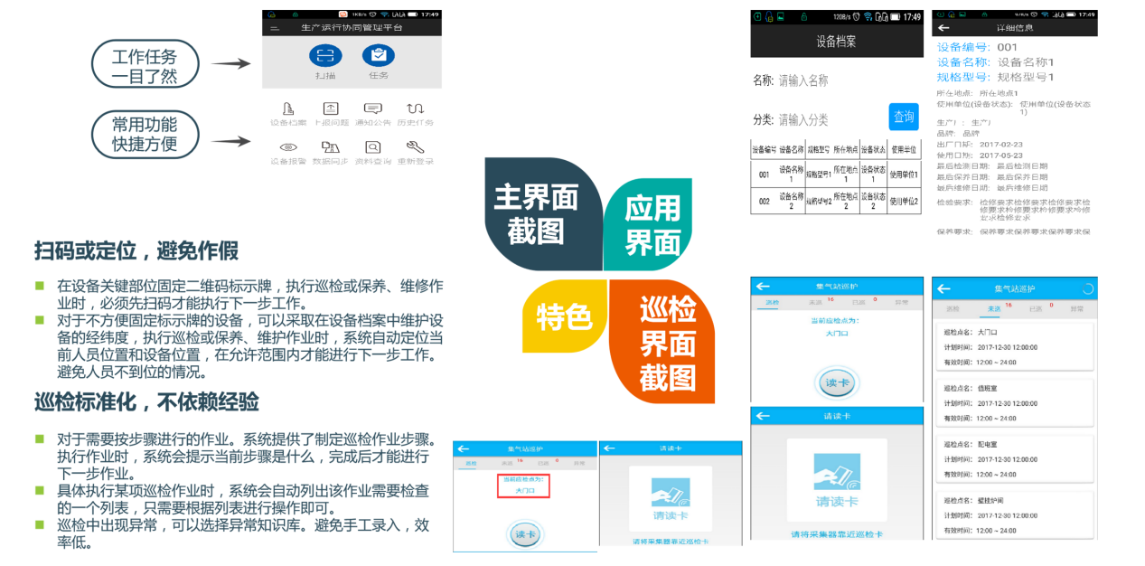 利用移動端設備對設備日常點檢保養檢修等工作提供有力支撐。通過移動端和后臺管理系統的聯動,將業務流程、環節有機地組織在一起,用戶可以通過交互操作進行業務的瀏覽查詢。使用戶可以方便地按自身的工作習慣進行操作。