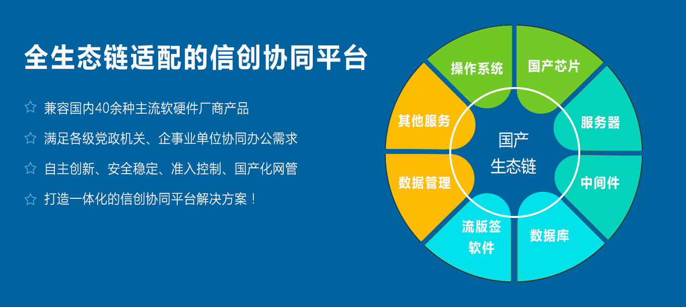 九思信創生態系列產品是積極響應國家信息技術應用創新指導方針, 從國家全局戰略出發,兼容國內40余種主流軟硬件廠商產品包括CPU芯片、 服務器、操作系統、數據庫、中間件、常用辦公軟件等, 打造的全生態鏈適配的一體化信創平臺解決方案。 九思信創生態產品輔助政府、企事業單位建立自主創新、 安全穩定的內部智能化一體管理平臺。