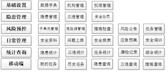 系統從業務上分為安全風險預控和安全隱患檢查及隱患排查兩大部分,管理手段上擴展了基于手持設備的應用APP。