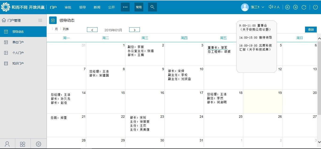 領導動態門戶,采用了扁平化的界面設計。整個界面通過日歷的形式展示,如下圖,用戶可以查看一周內單位領導動態。鼠標點擊或者靠近某一日期的領導名字時,系統顯示提示框,提示各時間段內的會議、計劃管理、日程安排等內容,領導最新日程一目了然。用戶可以通過切換向左或者向右的按鈕,切換到不同的日期,顯示領導動態。