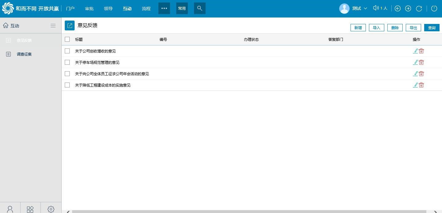 本模塊是為了實現高層決議對單位員工的意見反饋以及方案的調查征集,如下圖,互動模塊包括兩層菜單,分別是意見反饋和調查征集。